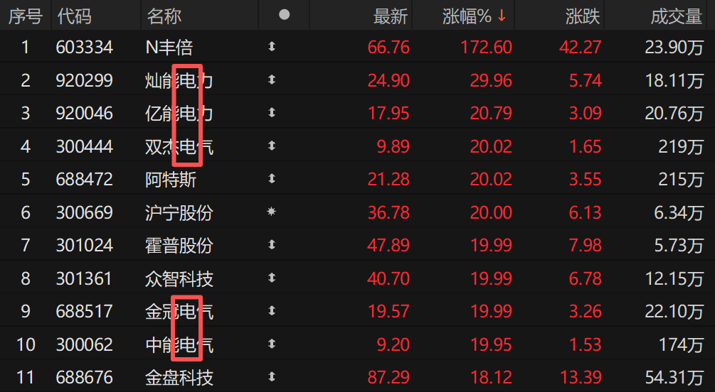 今日,电力设备概念股集体爆发,包括双杰电气、特变电工、保变电气、太阳电缆在内共计十余股涨停。纵观今日涨幅榜,多只证券简称中含有“电”字的个股位居前列。