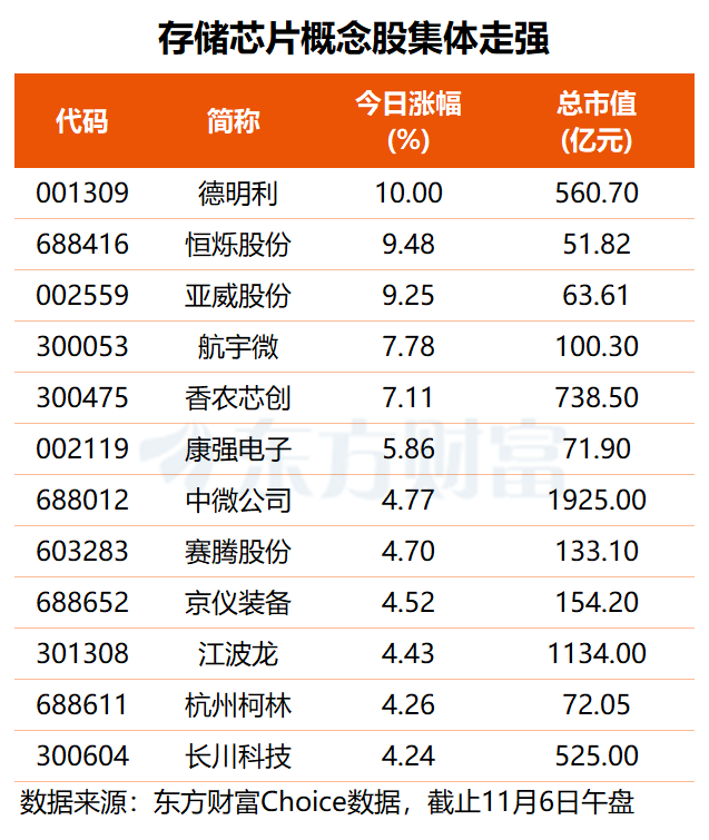 存储芯片概念股早盘集体走强,德明利封涨停,亚威股份、恒烁股份涨超9%,香农芯创、航宇微等涨超7%,江波龙、中微公司、兆易创新等多股跟涨。