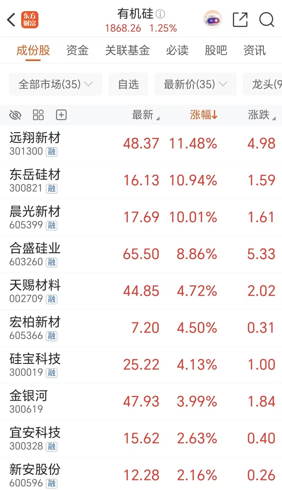 涨价概念正在扩散!继六氟磷酸锂、VC概念之后,周三(11月19日)有机硅概念爆发。个股方面,远翔新材涨超11%,东岳硅材涨超10%,晨光新材涨停,走出3天2板,合盛硅业大涨近9%,宏柏新材、硅宝科技等多股跟涨。