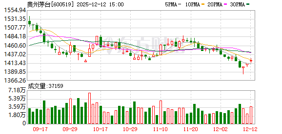 截至12月12日收盘,贵州茅台报1420.65元/股,涨幅为0.61%,总市值1.779万亿元。